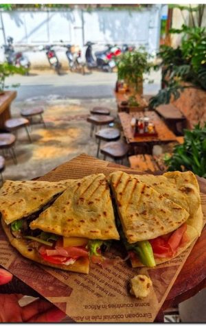 Deepfried Chicken,American Cheese,Cucumber,grilled Zucchini and Chilly Sauce 190 k